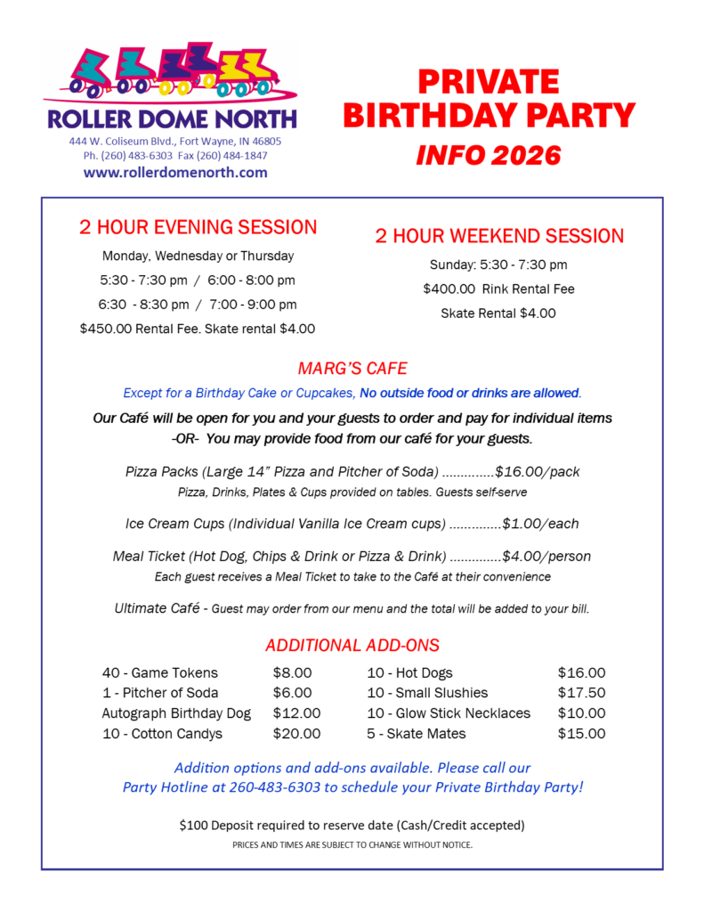 For School, Church, Corporate or Late Night Lock-in Parties CALL 260-483-6303 for information and pricing..