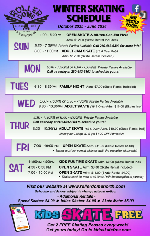 Take a look at our schedule, print it out!  Any questions, call us at 260-483-6303.